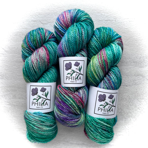 Hand-dyed in small batches. No two skeins will ever be identical. Please be sure to to purchase enough to finish your project or alternate two or more skeins every other row/round when knitting/crocheting to ensure even color distribution.