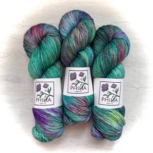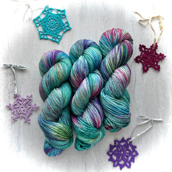 Hand-dyed in small batches. No two skeins will ever be identical. Please be sure to to purchase enough to finish your project or alternate two or more skeins every other row/round when knitting/crocheting to ensure even color distribution.
