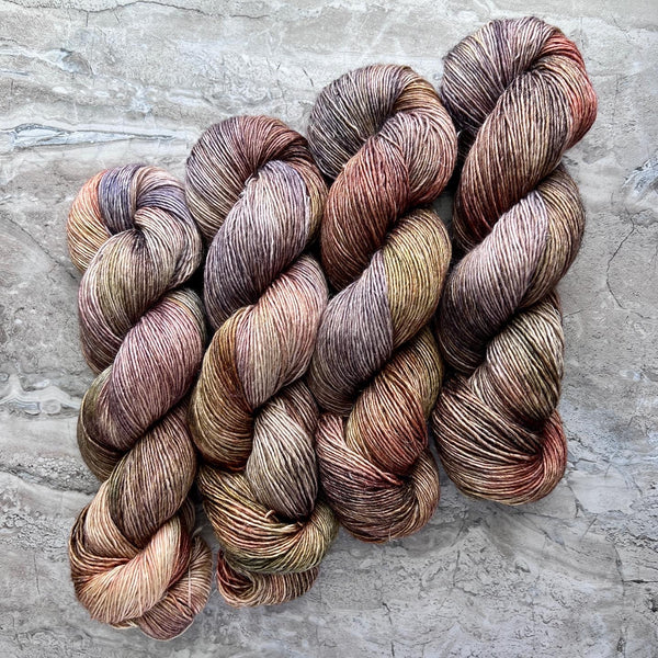 Hand-dyed with care in small batches. Yarn is thoroughly washed multiple times, but some light bleeding may occur during the first wash. Dyelots may vary slightly. Please be sure to purchase enough to finish your project and/or alternate two or more skeins while making to ensure even color distribution. Photos are meant to be as true of a representation of the yarn as possible, but there may be slight differences due to monitor settings, etc.