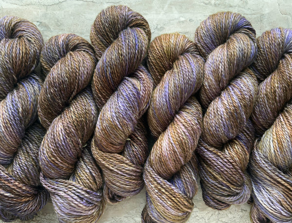 Hand-dyed with care in small batches. Yarn is thoroughly washed multiple times, but some light bleeding may occur during the first wash. Dyelots may vary slightly. Please be sure to purchase enough to finish your project and/or alternate two or more skeins while making to ensure even color distribution. Photos are meant to be as true of a representation of the yarn as possible, but there may be slight differences due to monitor settings, etc.