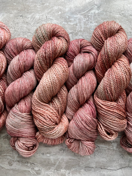 Hand-dyed with care in small batches. Yarn is thoroughly washed multiple times, but some light bleeding may occur during the first wash. Dyelots may vary slightly. Please be sure to purchase enough to finish your project and/or alternate two or more skeins while making to ensure even color distribution. Photos are meant to be as true of a representation of the yarn as possible, but there may be slight differences due to monitor settings, etc.